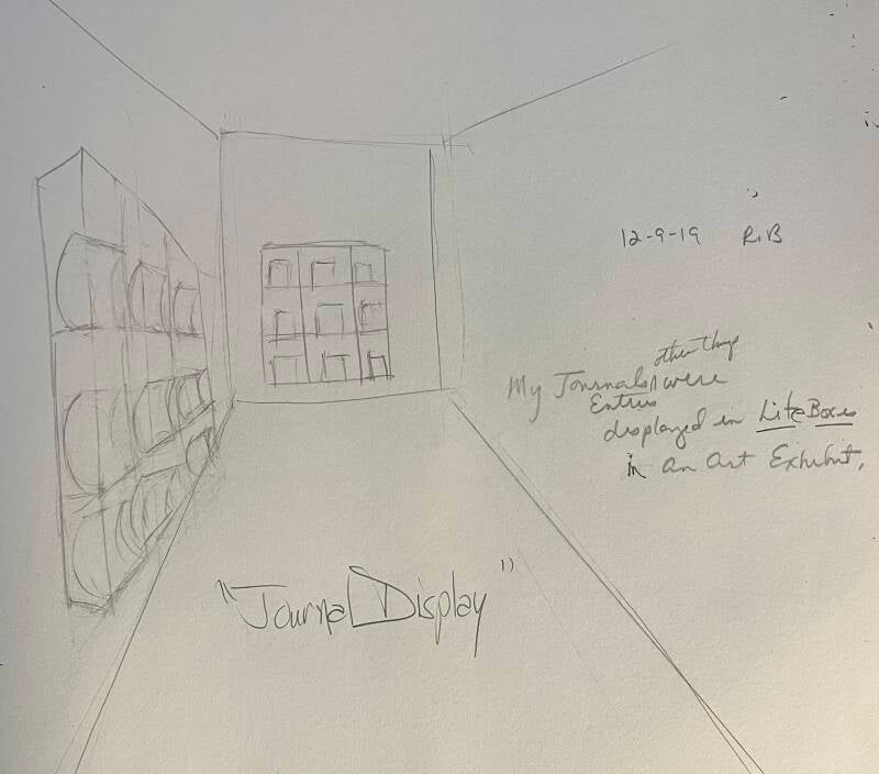 While discussing possible ways of exhibitng my dream journal archives with Advisor M Bowdidge he recommended laying them all out on wall. I told him of the above dream I had in 12-9-2019 " Journal display", where an exhibit of my journals and ''other things" was depicted. The journal pages were individually displayed in a grid like position in clear boxes that were lit on wall.There we're 2 walls of them in the dream.