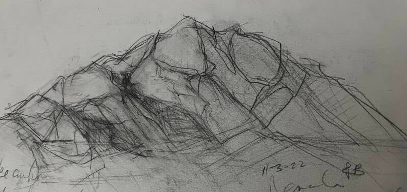 In my dream on 11/1/22 remember seeing a vision of mount Denali divided into platelets in my journal sketch I attempt to recreate the vision(etched in my minds eye of what I saw. (i forsee a painting but must commit to practice and (See) ..
