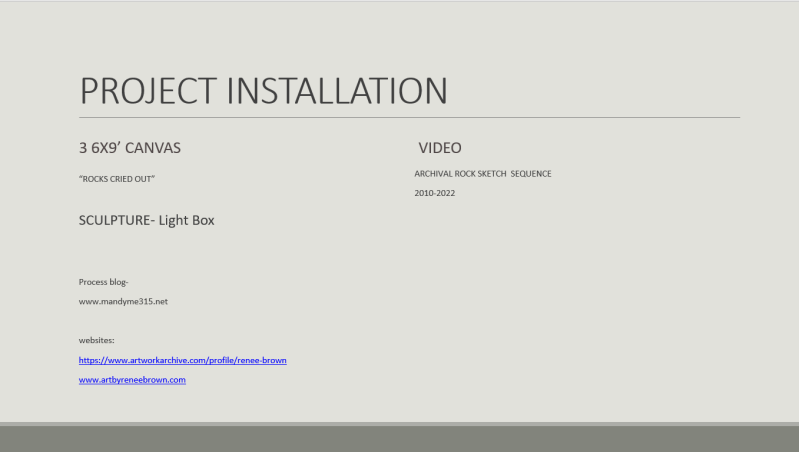My MFA research proposal is centering on my sketches of rocks since 2010. This is my point of departure and is foundational in my practice.. For the proposal I am doing an archival exploration of various views of rocks that I have sketched since 2010. Along with dream journaling these two practices allow me to receive and respond to my night season. Sketching and journaling are foundational in my practice. I use both methods before moving on to the next stage of expression. Balance in mind, body, spirit and a spontaneous flow in lines of my sketches' of rock must be embodied in my preparation to make art.