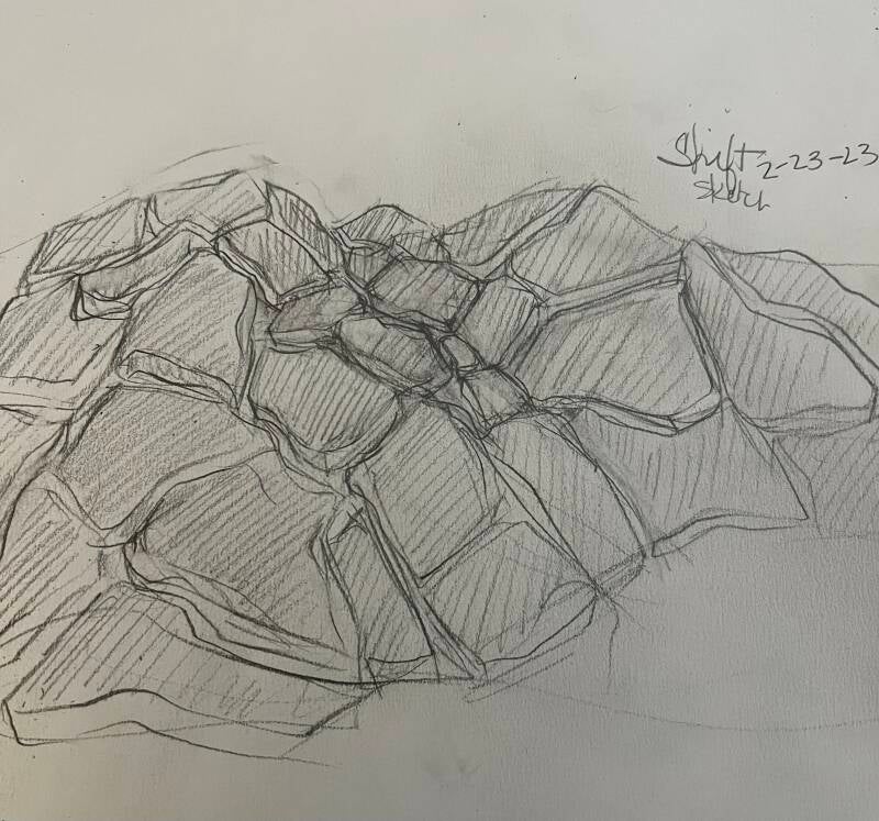 SHIFT 2-23-23 - AS I SKETCH I CONTINUE TO ATTEMPT TO ITERATE THE SPACE IN BETWEEN ROCKS