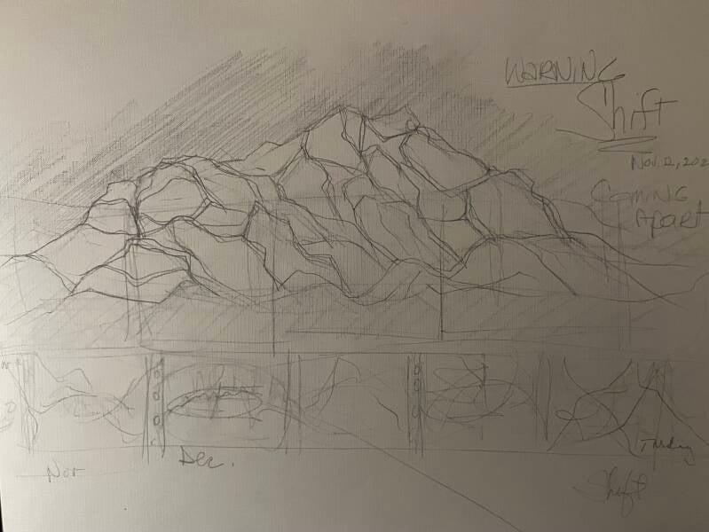 Shift sketch in progress 2/12/23 - As i sketched this image i heard a voice witin say go back to the initial shift dream and capture the shift in the rocky mountain not form.......in other words hold true to the initial essence of the vision in the dream.